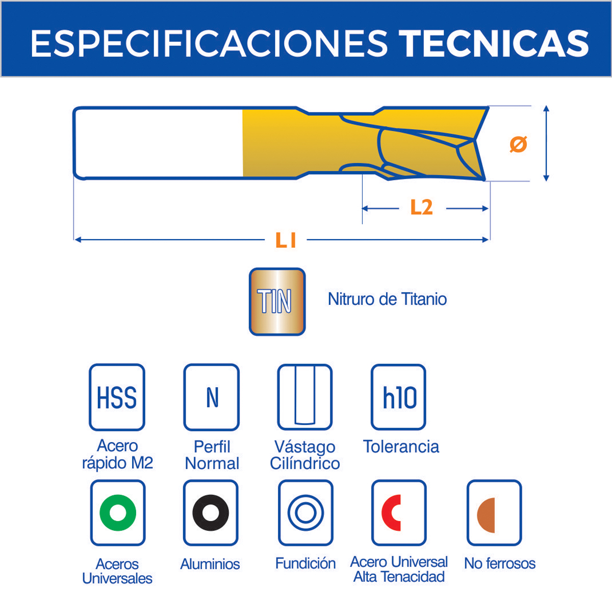 El revestimiento en Nitruro de Titanio otorga a la herramienta un mayor rendimiento. (ver info técnica)